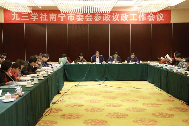 12月10日,九三学社南宁市委员会召开参政议政工作会议,对2017年初各基层组织招投标中标课题进行宣讲,对担任各级人大代表、政协委员的社员所提交的提案素材进行讨论,征集2018年度市政协集体提案和大会发言材料。南宁市政协副主席、九三学社南宁市委员会主委梁鸿,副主委廖建山、苏春蓉、杨海翔,以及社市委会委员、各基层组织负责人、骨干社员61人参加,会议由专职副主委廖建山主持。